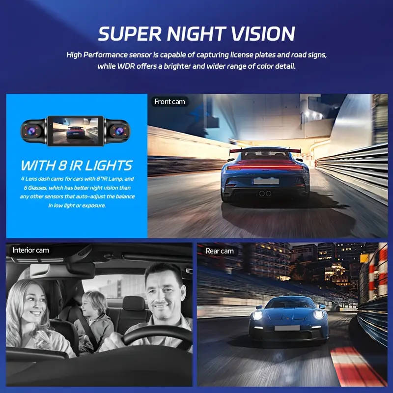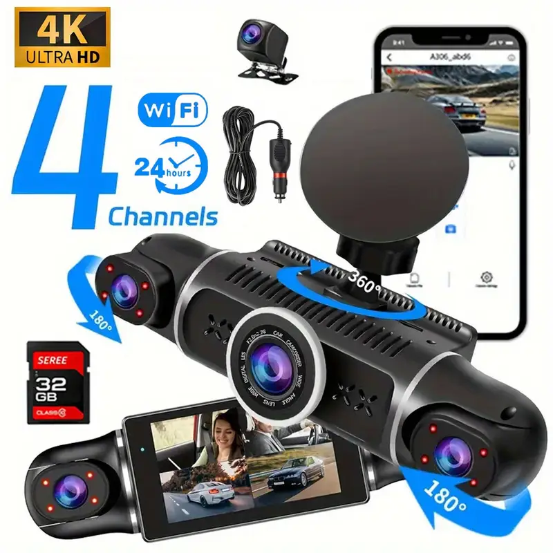 Drive smarter and safer with the 4K Ultra HD Four-Channel Car Dash Cam — the ultimate in-vehicle surveillance system. Designed with 4 wide-angle lenses, it delivers 360° coverage and ultra-clear 4K resolution to capture every detail, from license plates to unexpected incidents.